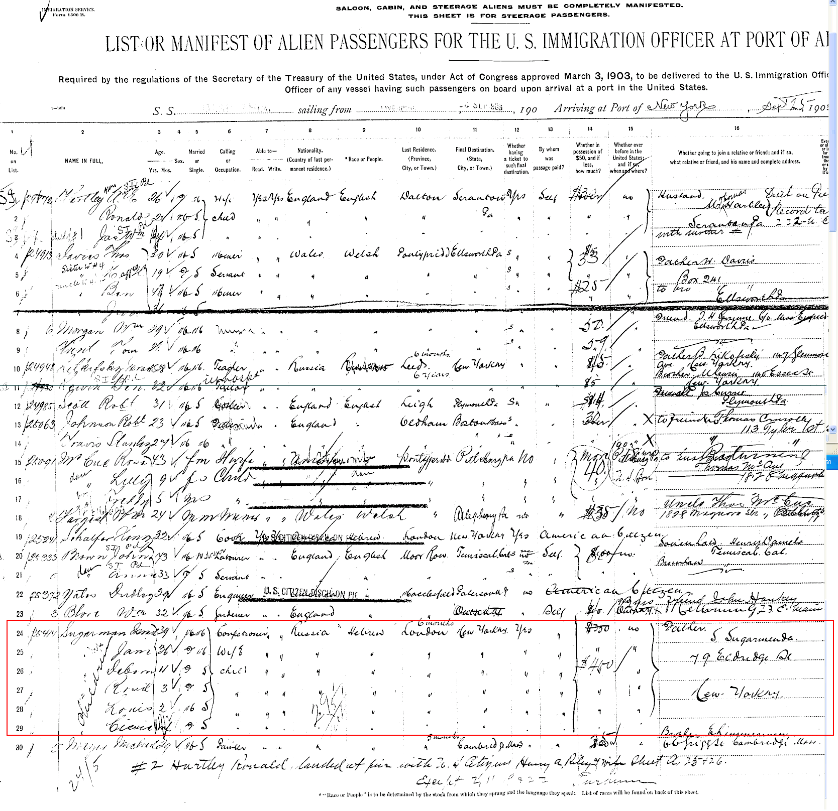 - 1903 - Sept. 25th. arrives in the USA (aged 36) with husband Israel, confectioner (aged 39), and children Deborah (aged 11), Rosil (aged 3), Louis (aged 2) , Cissia (just born ? ) travelling steerage on the Carpathia.