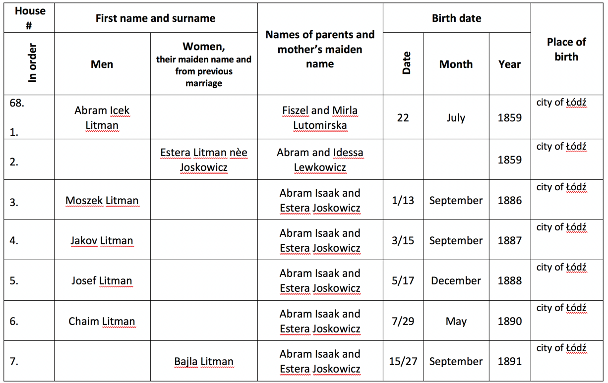 Document from the Lodz Archives listing the Litman family living at House number 68 | |||||||||||||||||||||||||||||||||||||||||||||||||||||||||||||||||||||||||||||||||||||||||||||||||||