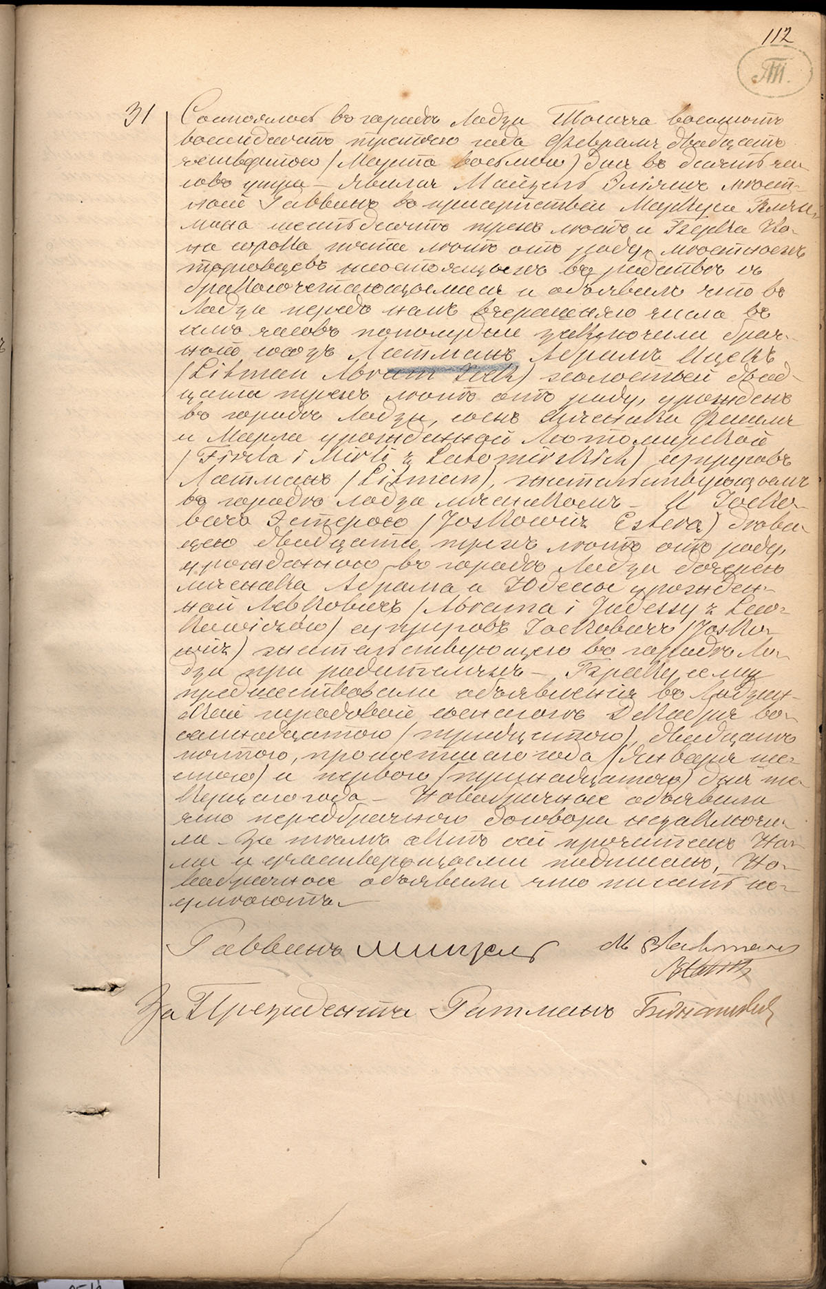 Translation Akta 31. This happened in the city of Łódź in the year 1883 on the twenty fourth of February / eighth of March at ten o’clock in the morning. Eliasz Majzel appeared, the local Rabbi, in the presence of Beniamin Marlus [?], sixty three years old, and Berek [last name illegible], forty six years old, a local merchant, not related to the newlyweds; and they announced that in Łódź before them yesterday at seven o’clock in the afternoon a religious marriage was contracted between Abram Icek Litman, a bachelor, twenty three years old, born in the city of Łódź, a son of Fiszel and Mirla nèe Lutomirska married couple the Litmans, he resides in the city of Łódź and is a butcher [?]; and between Estera Joskowicz, a maiden, twenty three years old, born in the city of Łódź, a daughter of Abram and Judessa nèe Lewkowicz married couple the Joskowiczes, she resides in Łódź with her parents. This marriage was preceded by three readings of the banns in the Łódź Jewish synagogue on the eighteenth / thirtieth of December, the twenty fifth of December / sixth of January, and the first / thirteenth of January. The newlyweds announce that they have made no prenuptial agreement. Then this record was read and signed by Us and the witnesses. The newlyweds announced that they are unable to write. [signatures] |