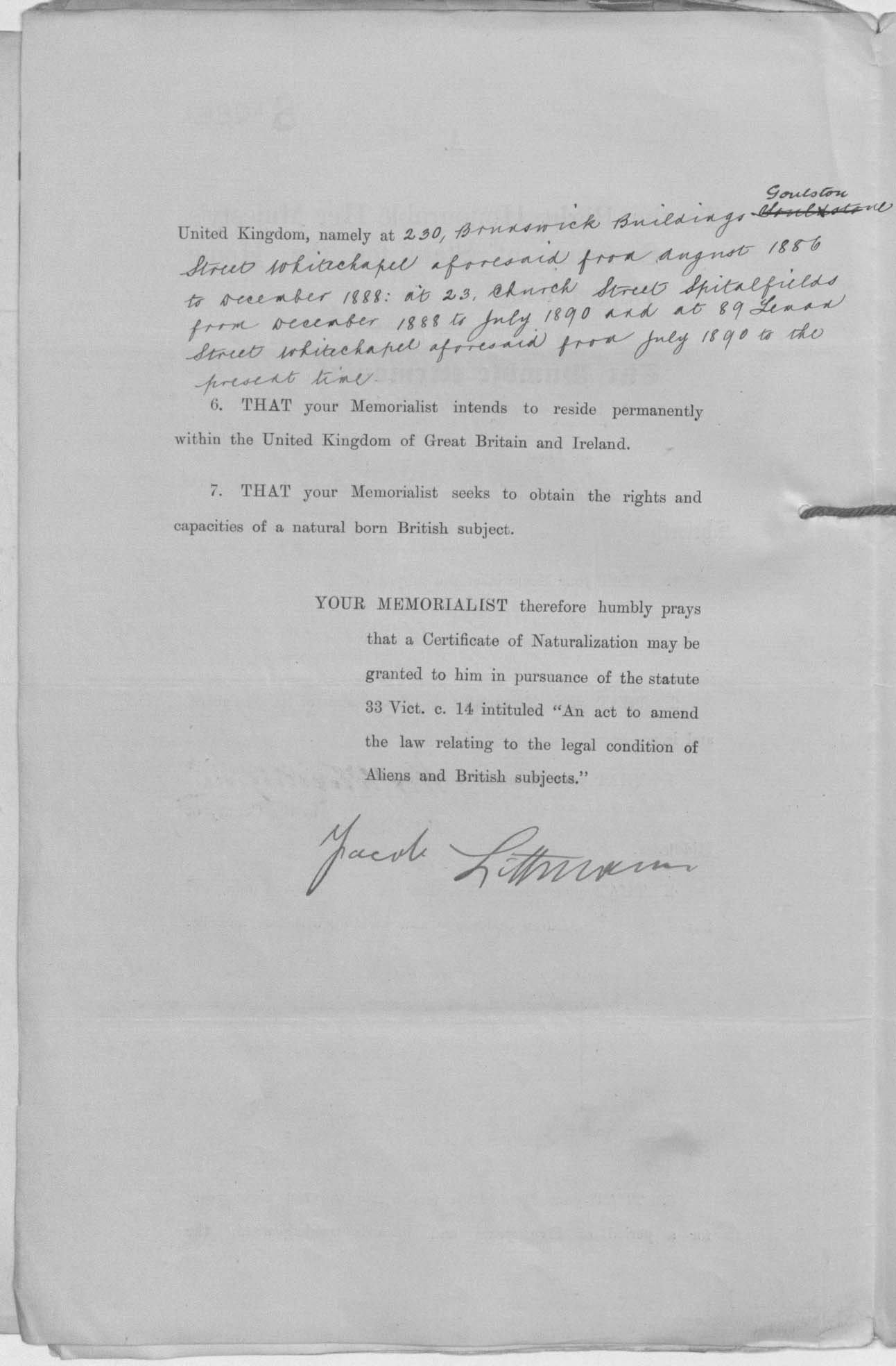 The humble memorial of Jacob Littmannof 89 Leman Street Whitechapel London. 1. That your Memorialist is a subject of Russian having been born at Lodz Petreskowski in eth Empire of Russia on the 13th November 1863 and is the son of Fiszel Littmann and Mirla Littmann both of Russina Nationality. Three children Rebecca, Benjamin and Abraham.
