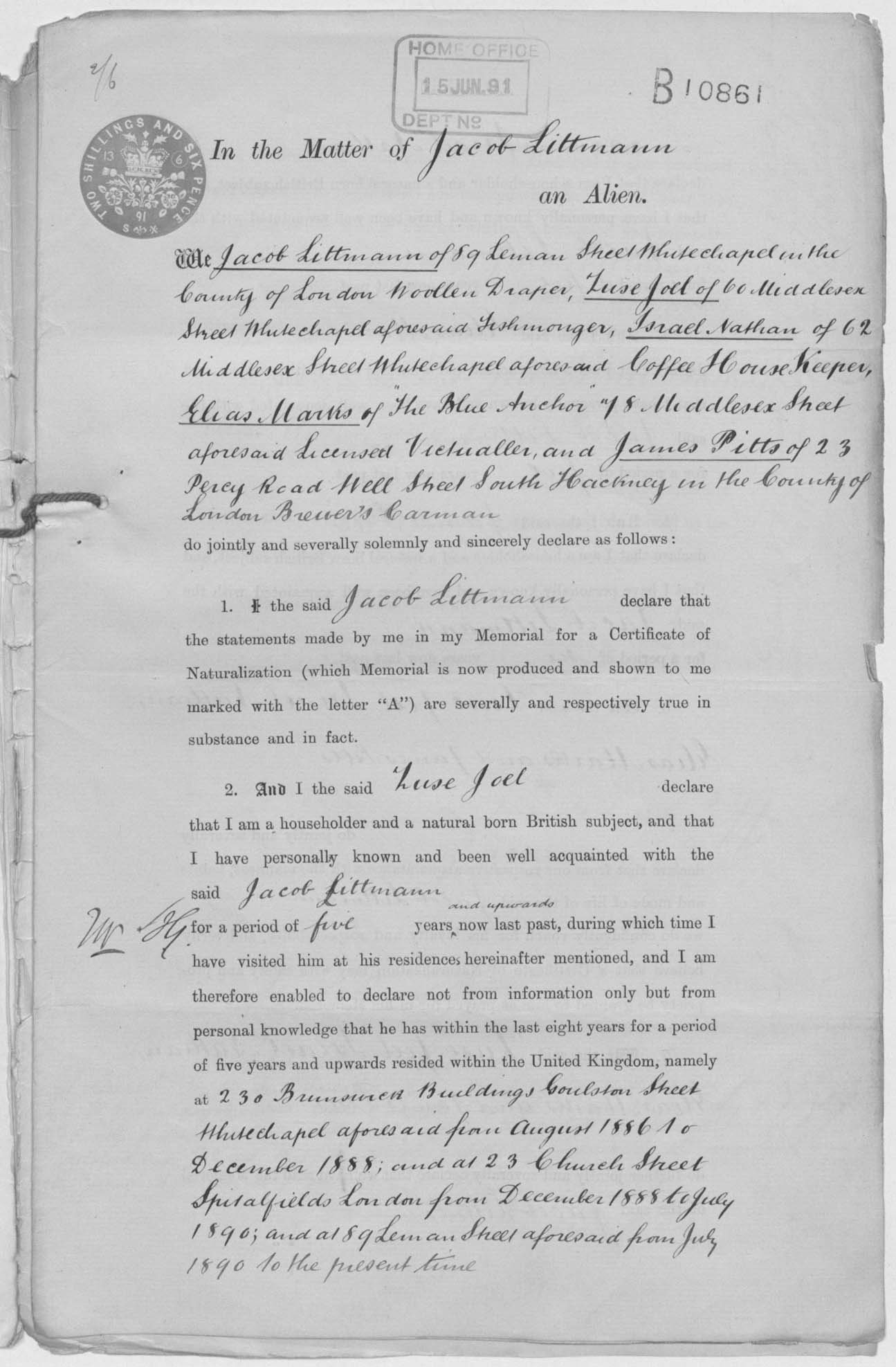 Page 6: 13th June 1891: Letter from Solicitor to Home Office to grant certificate of residency.