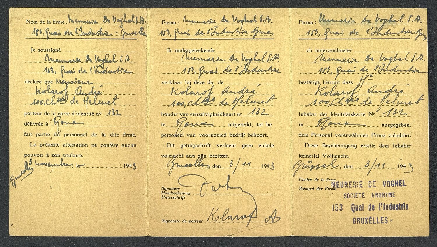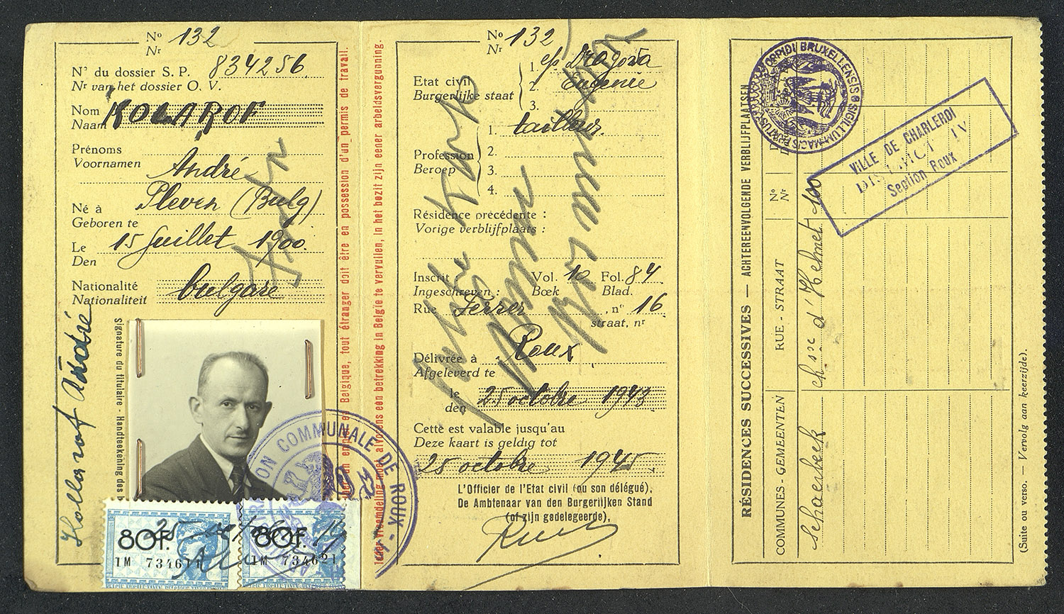 Naftali used the name Andre Kolarof, a Bulgarian, born 100 July 15. He is a tailor living at Chaussee de Helmet 100, Schaerbeek, Brussels. He used his real birthdate and profession, but a false address, but only 700 metres away from 68 rue Guido Gezelle where Naftali and Cesia were in hiding. One can only guess at the choice of this identity. His identity card could be demanded for inspection by a member of the German occupying forces at any time. If Naftali retained a foreign accent, posing as a French or Dutch speaking Belgian would have been seen through quickly. |