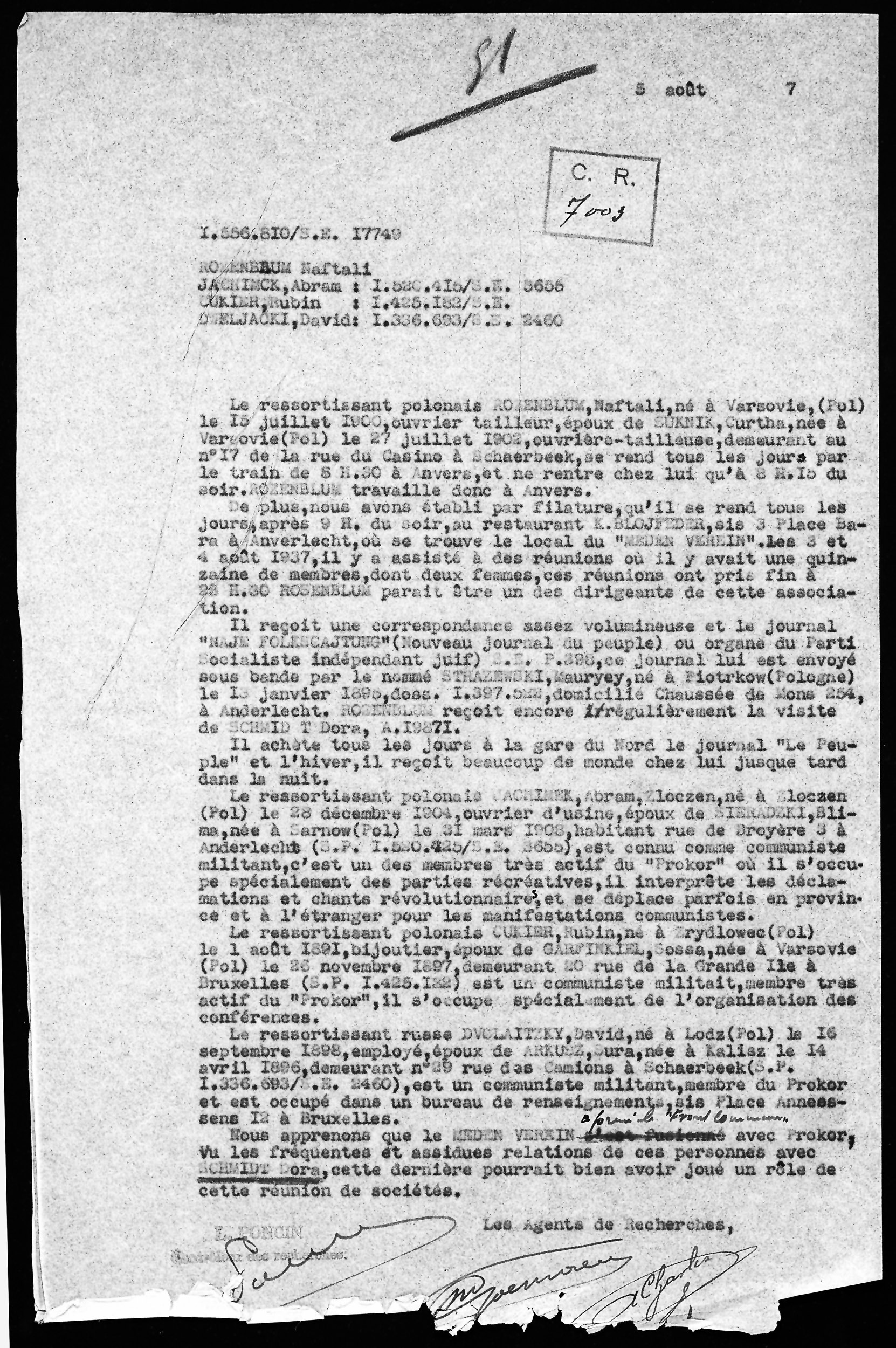 1940 November Naftali joined the army resistance group which passed en bloc to the Milices Patrotiques of the Front Patriotique I in July 1941. He engaged in a number of sabotage actions which included prevents delivery of material to the Wehrmacht, the destruction of the railway line between Brussels and Charleroi.3 and the destruction of military vehicles. He also helped with other illegal activities, fundraising etc). |