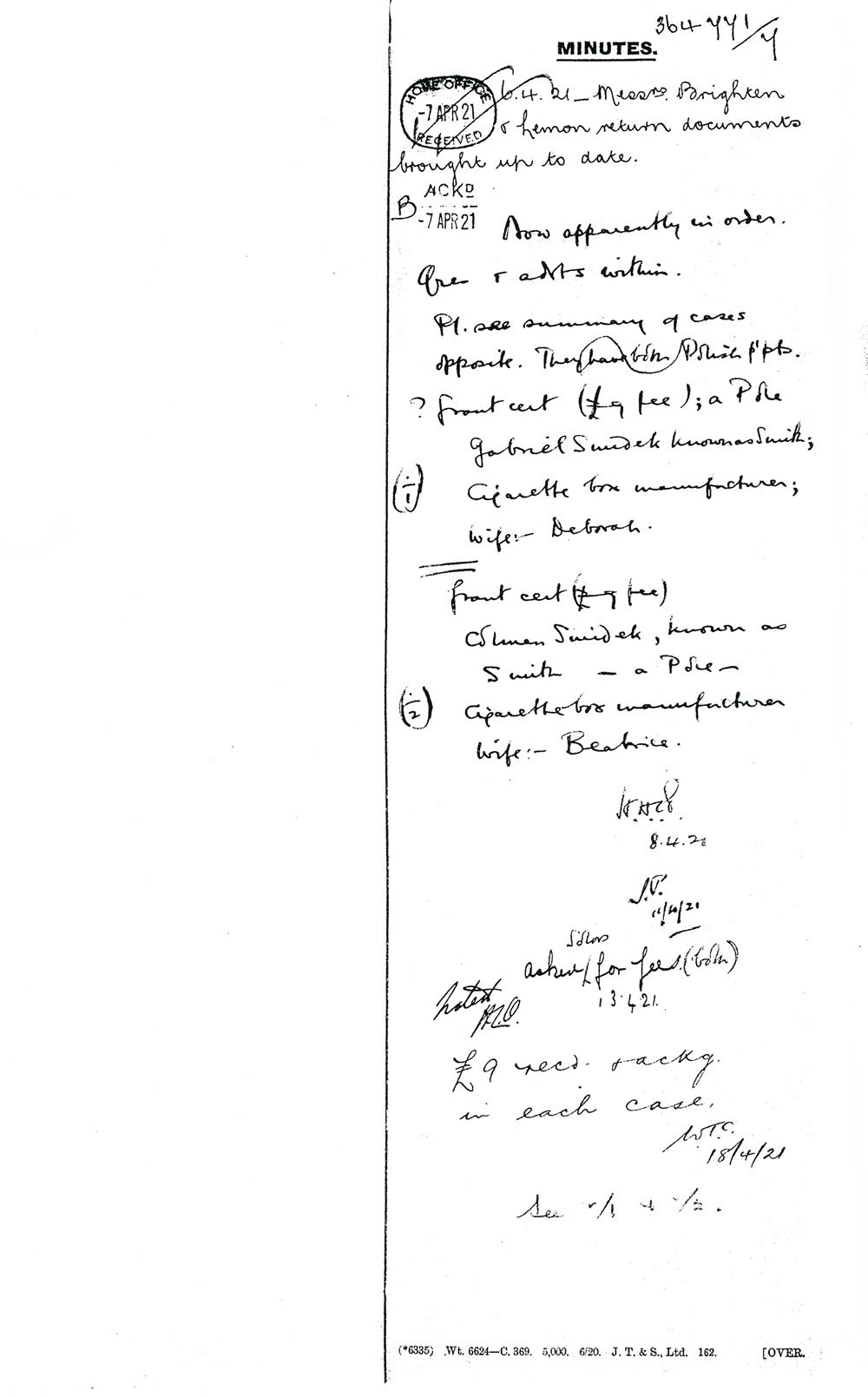 April 6th 1921 Letter from Gabriel's and Coleman's Solicitor to the Home Office (?)