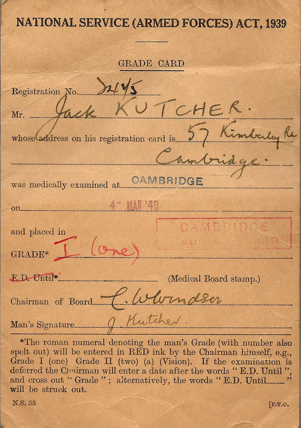 1940 Right: Grading card for men being physically examined for fitness for national service in the British armed forces.