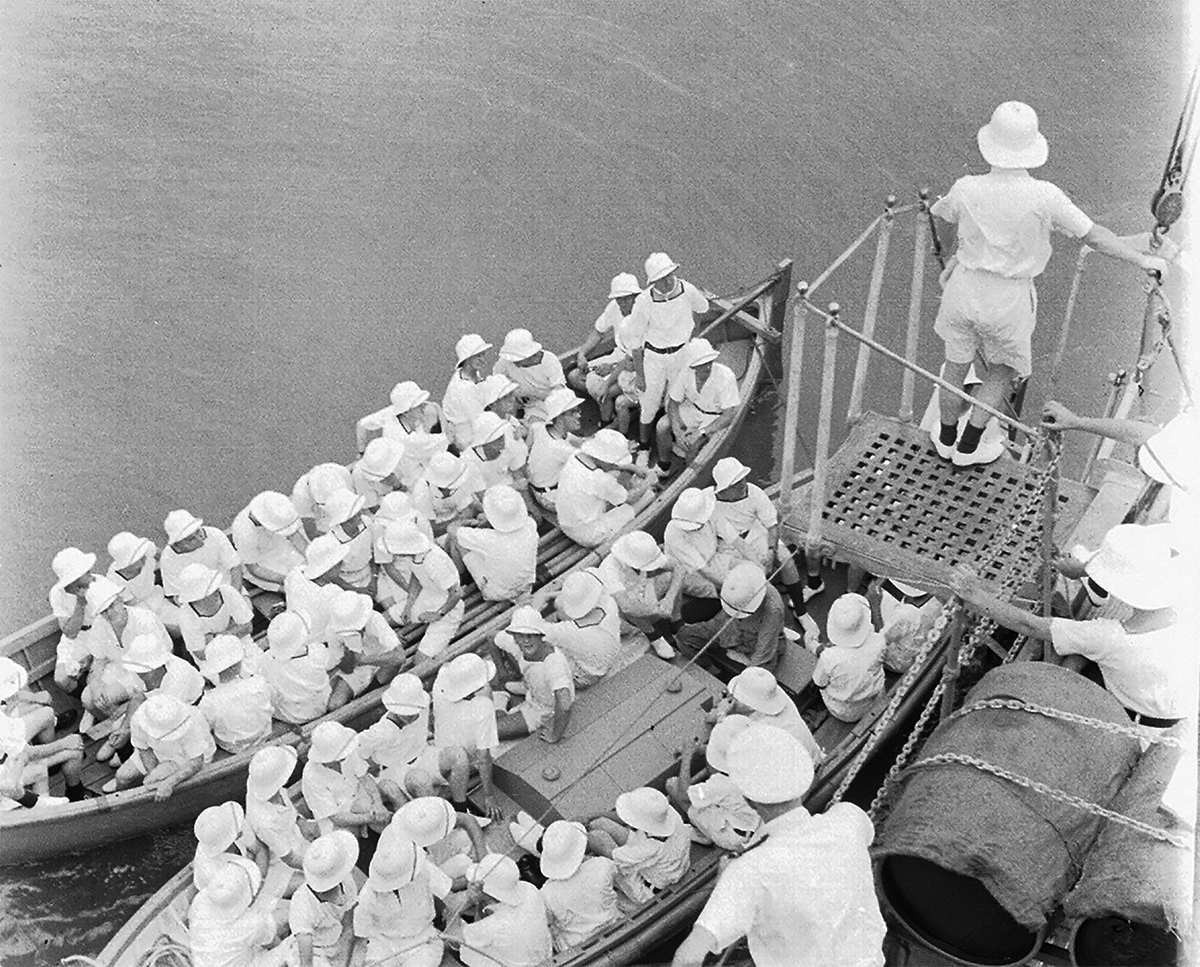 April 28 Wednesday: H.M. Ships VIRGINIA, ARMERIA, CYCLAMEN, THYME, and SNOWDROP with H.M.M.L.s 296, 289, 209, 266, and 287 returned Freetown together H.M. Ships ALCANTARA, MILFORD, AMARANTHUS, TAMARISK, WOODRUFF, MORRIS DANCE, and YESTOR from New Orleans and Trinidad, all escorting Admiralty Floating Dock XXIV being towed by Tugs FRISKY, ZWARTE ZEE, ORIANA, AIMWELL, and CROCODILE in company.